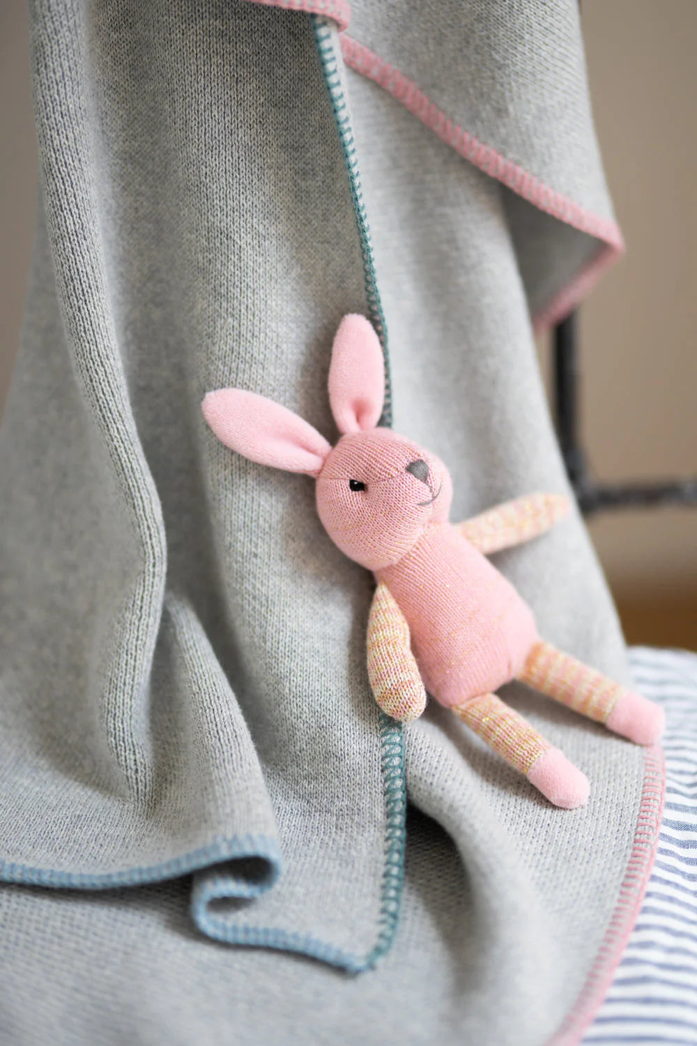 A classic design with a fun twist. Each edge has colour stitching, creating a beautiful colour pallet on each blanket; Blossom Pink & Baby Blue.