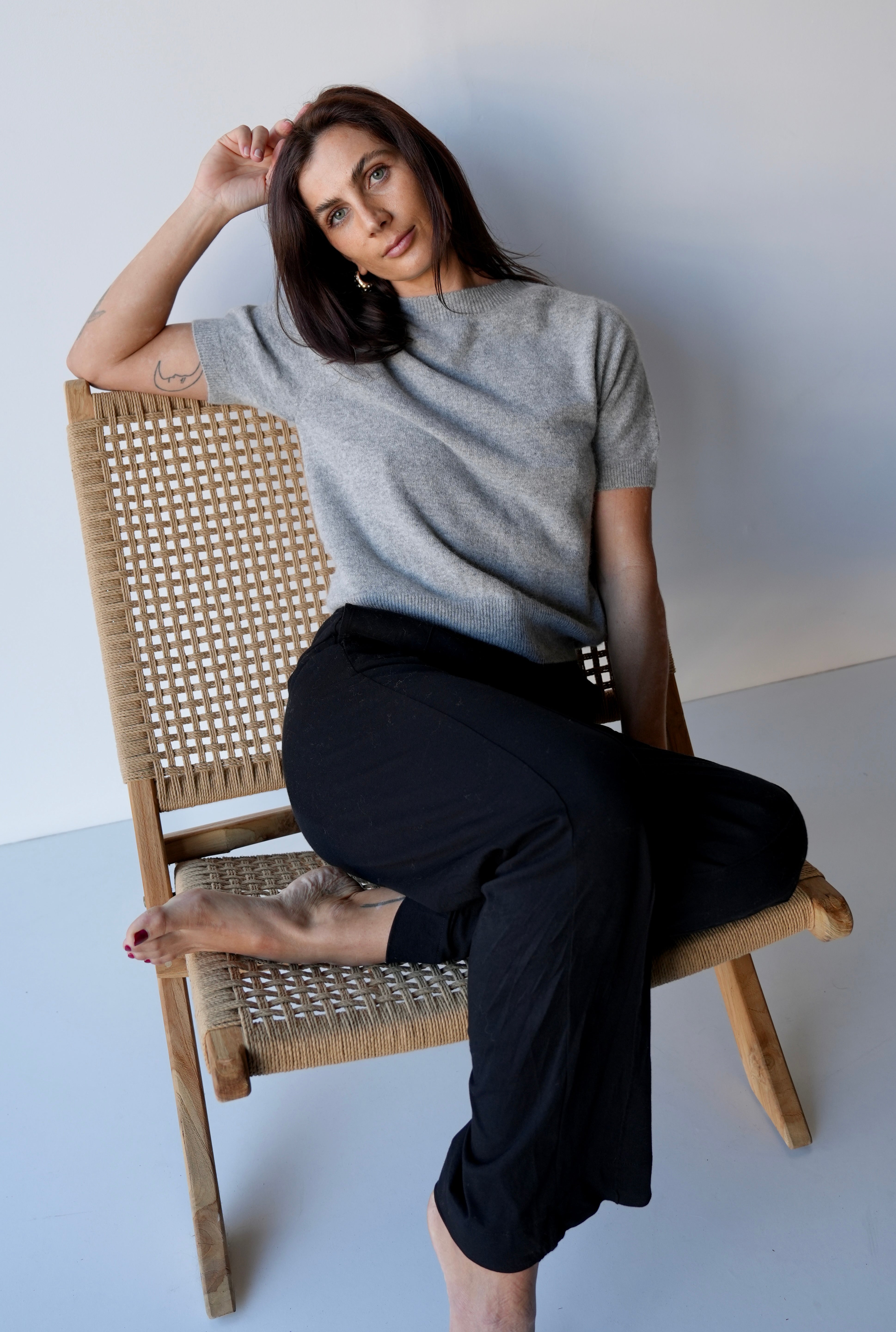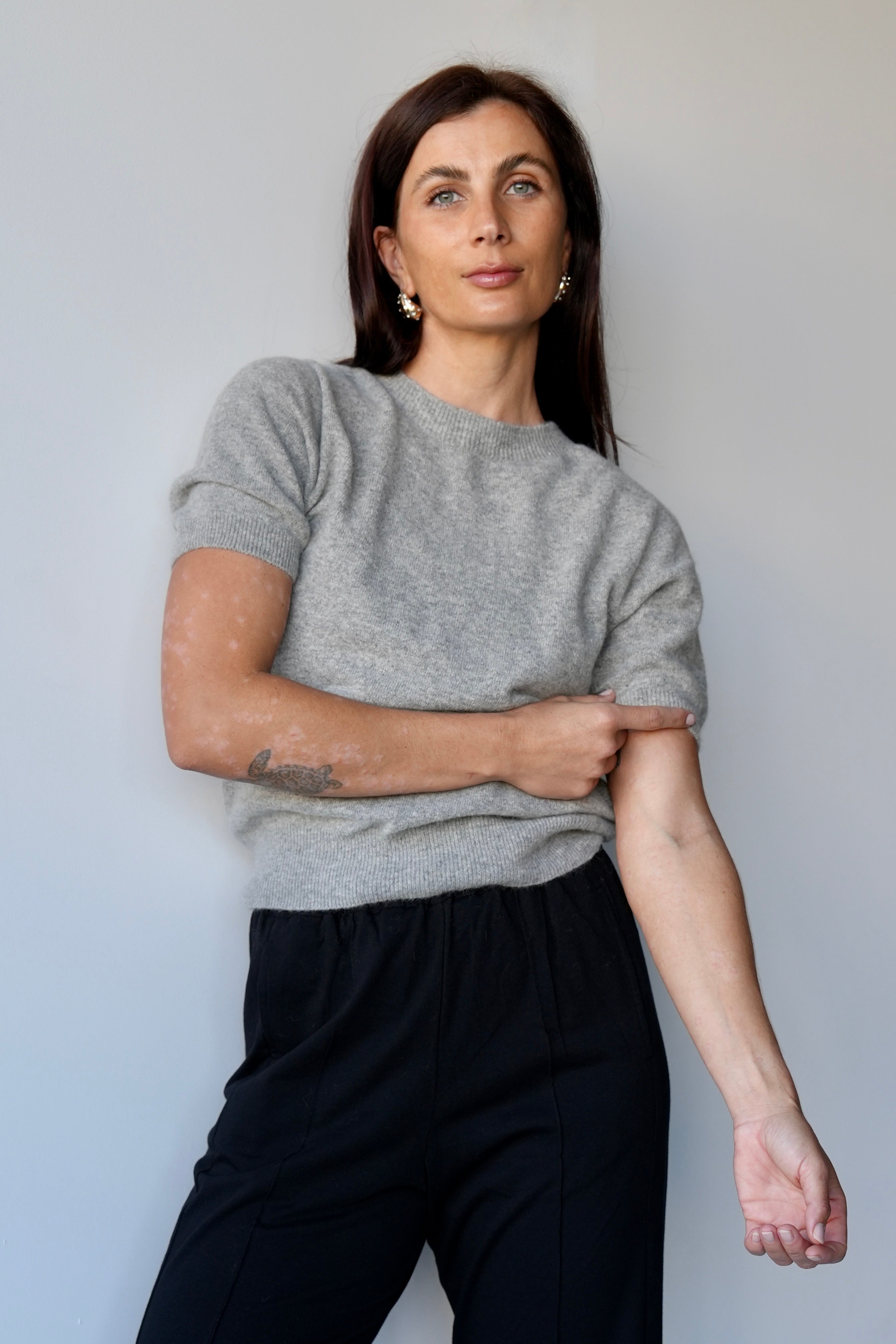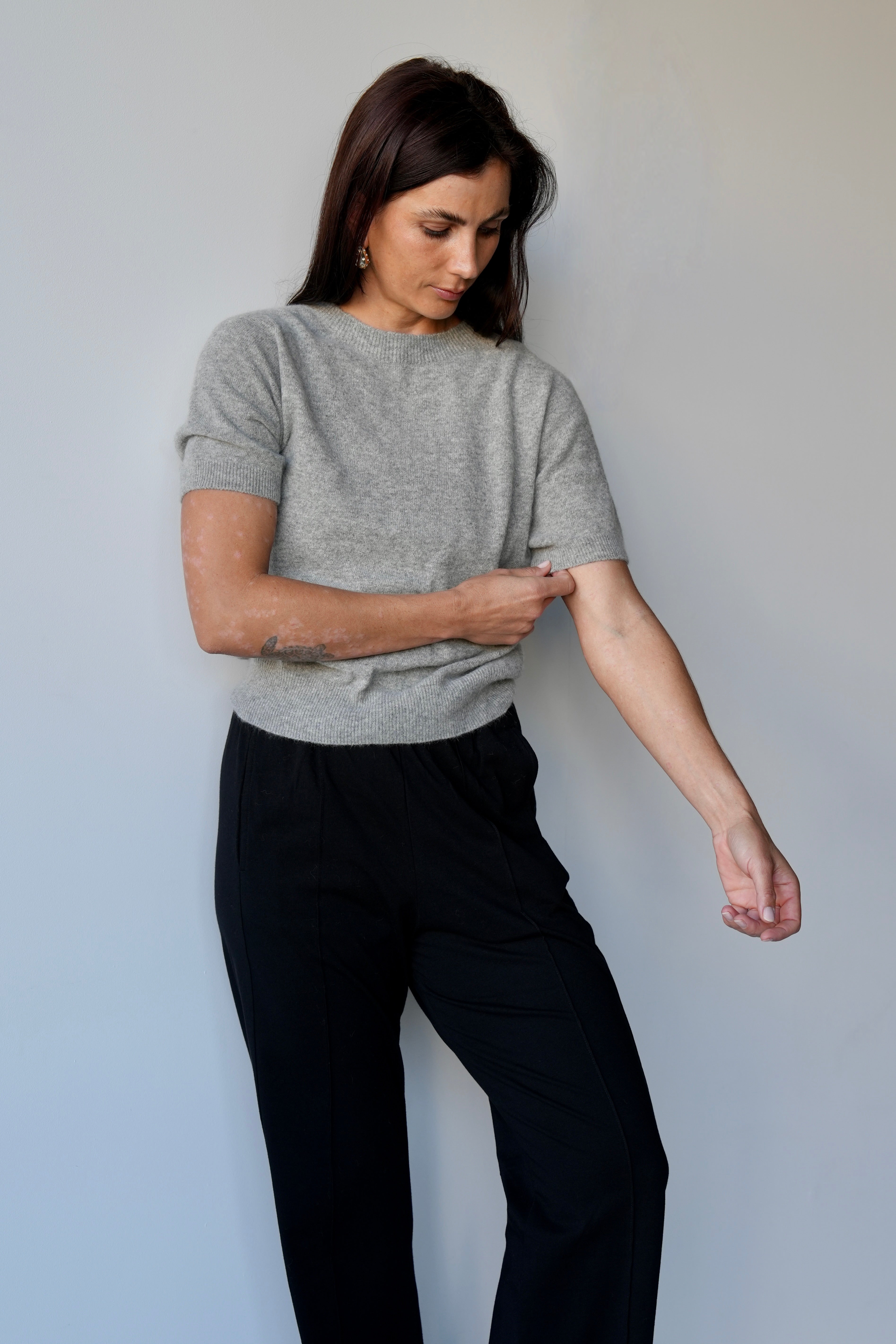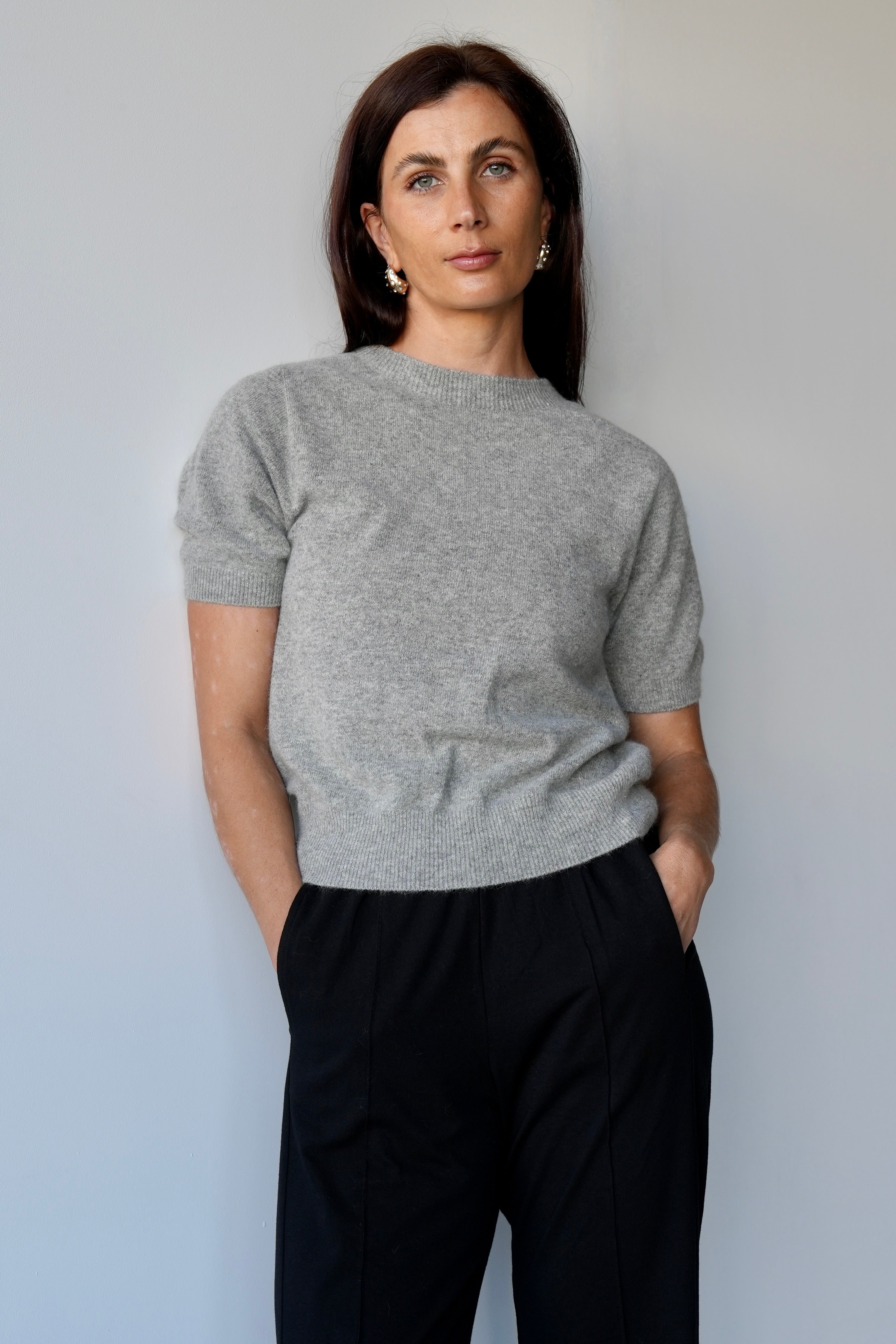 Luxuriously soft, fine knit cashmere short sleeve knit.