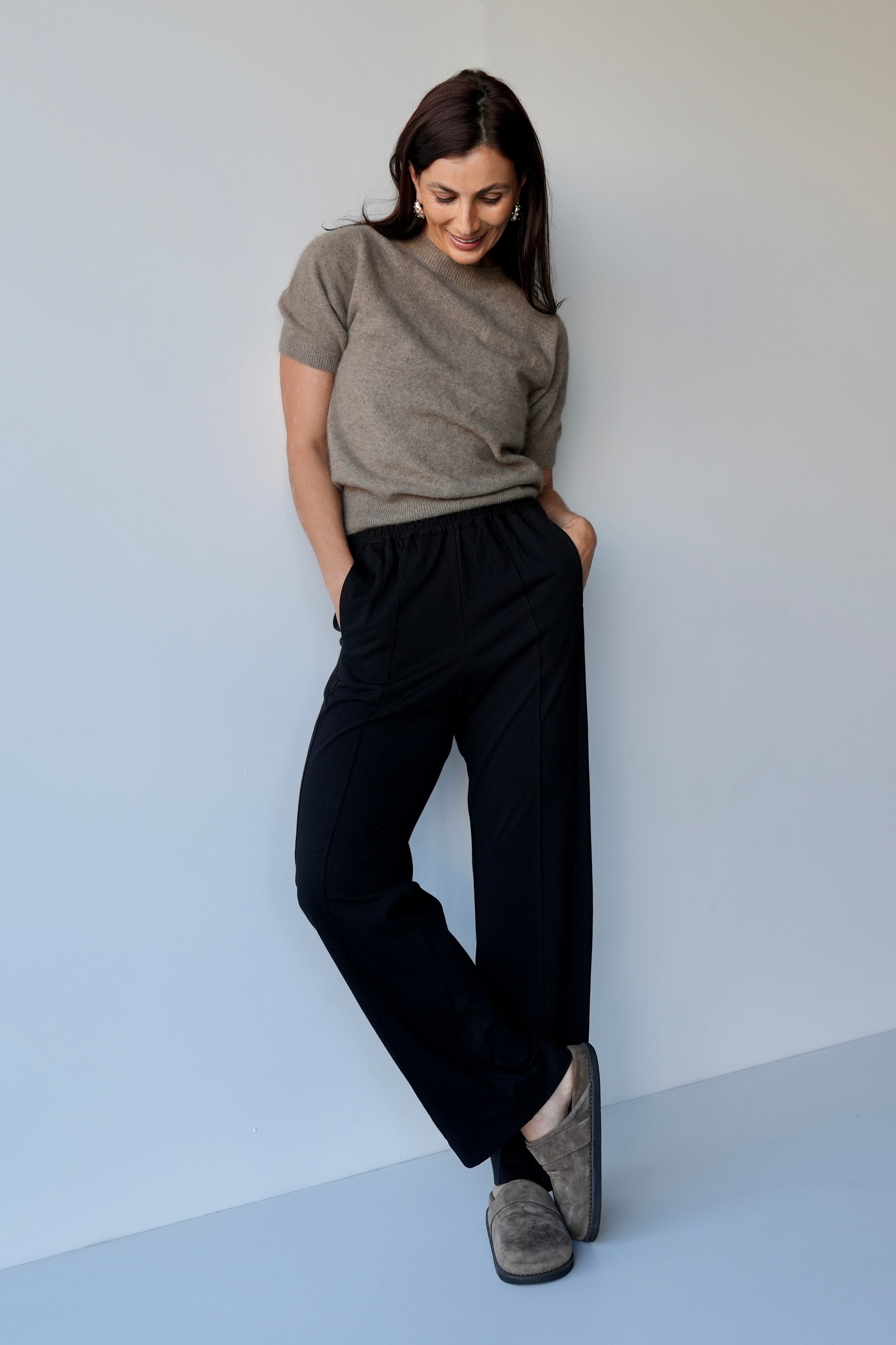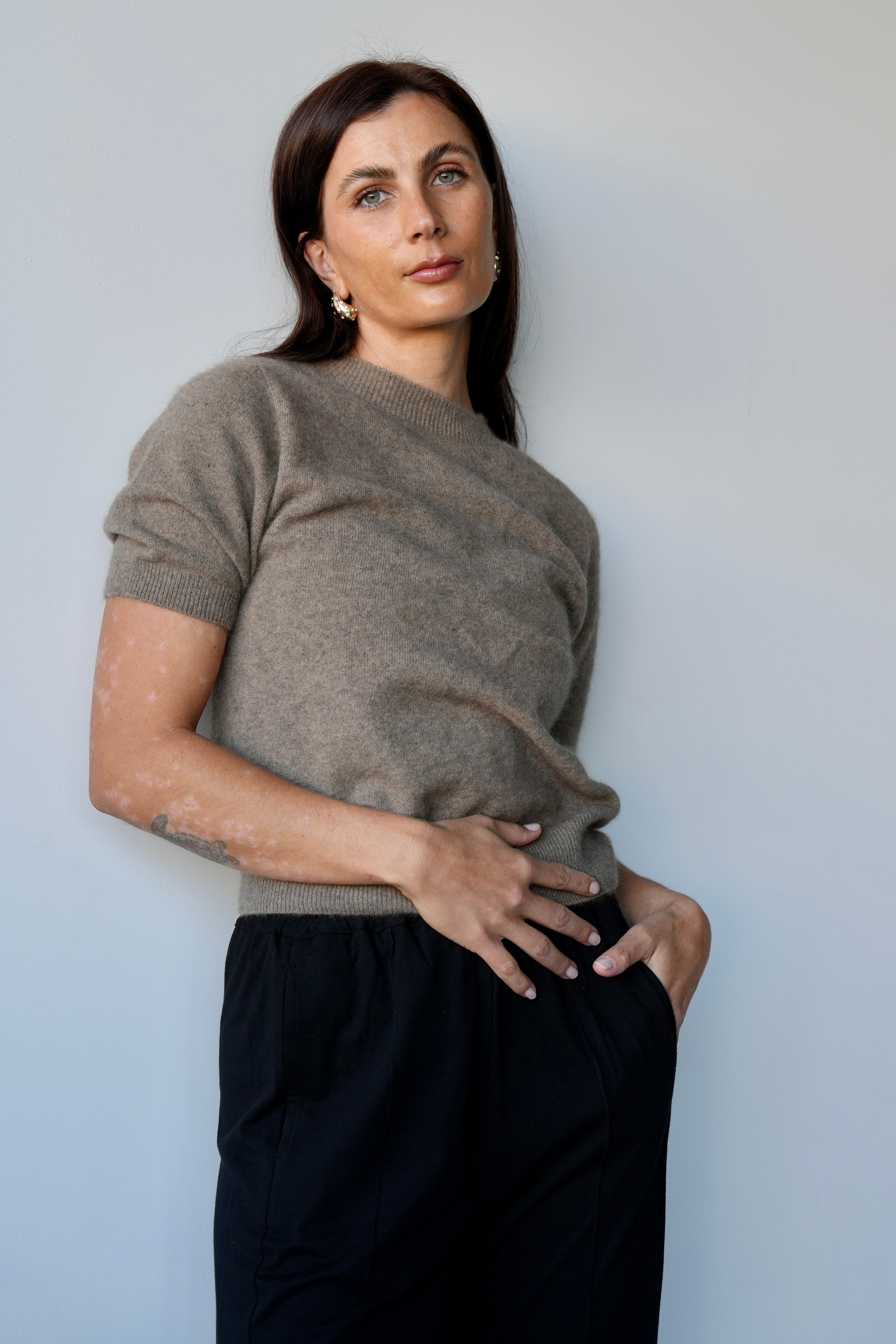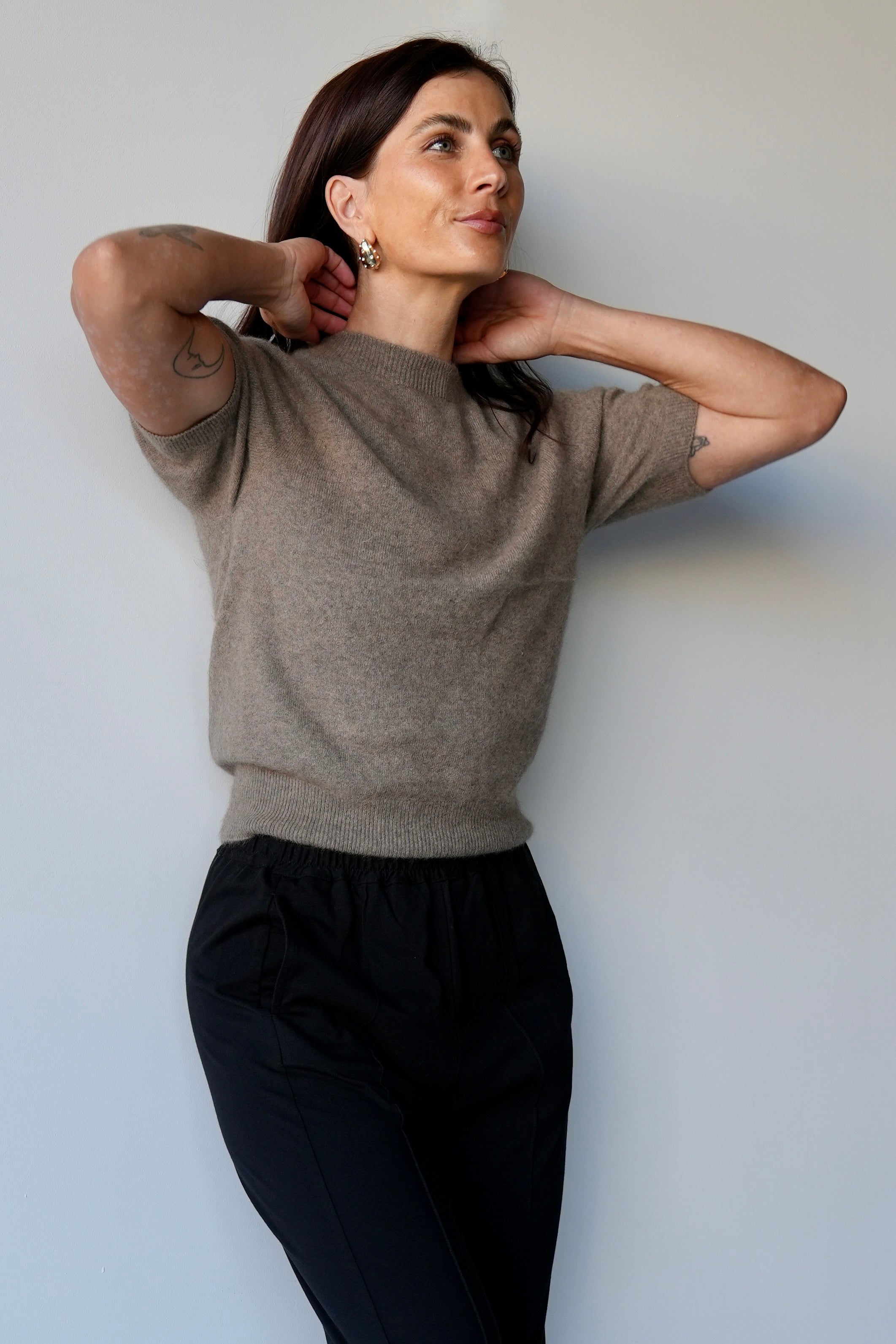 Luxuriously soft, fine knit cashmere short sleeve knit.