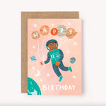 This cute and colourful illustrated birthday card is complete with a an astronaut floating in Space holding planet balloons with a hand-lettered birthday greeting. This outer Space themed children’s birthday card is perfect for a little explorer! Blank inside for a personal message